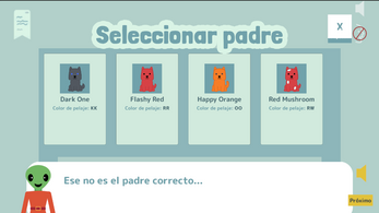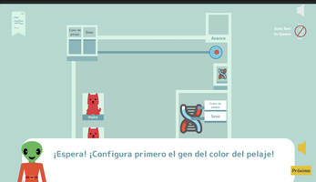 Instrucciones: Toca la pantalla para seleccionar los padres, los cromosomas y la información genética usando un cuadro de canastilla para crear la nueva mascota. Luego, toca los accesorios que quieras añadir para complacer a tus clientes.